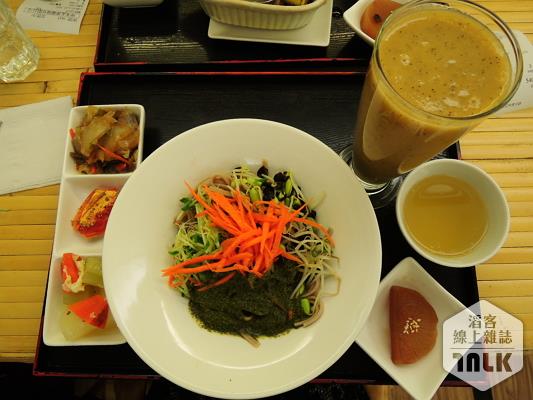 在眾多餐點中,美食滔客特為您挑選「燒肉涼麵+梅果醋飲」。這道看似家常且百元有找的平價料理,在製作過程中蘊含著許多巧思,以及手工的用心。涼麵的麵條以純手工製成,Q彈有勁,同時也保留麵條的原味;整道料理沒有過重的調味醬料,能夠真實吃出燒肉的原味,沾醬芝麻醬帶著淡清香一點也不油膩。整體搭配起來,細細品嘗後,口感清爽無負擔。飯後再來杯梅果醋飲,融合了梅子本身的香氣,酸度適中,還能幫助消化!